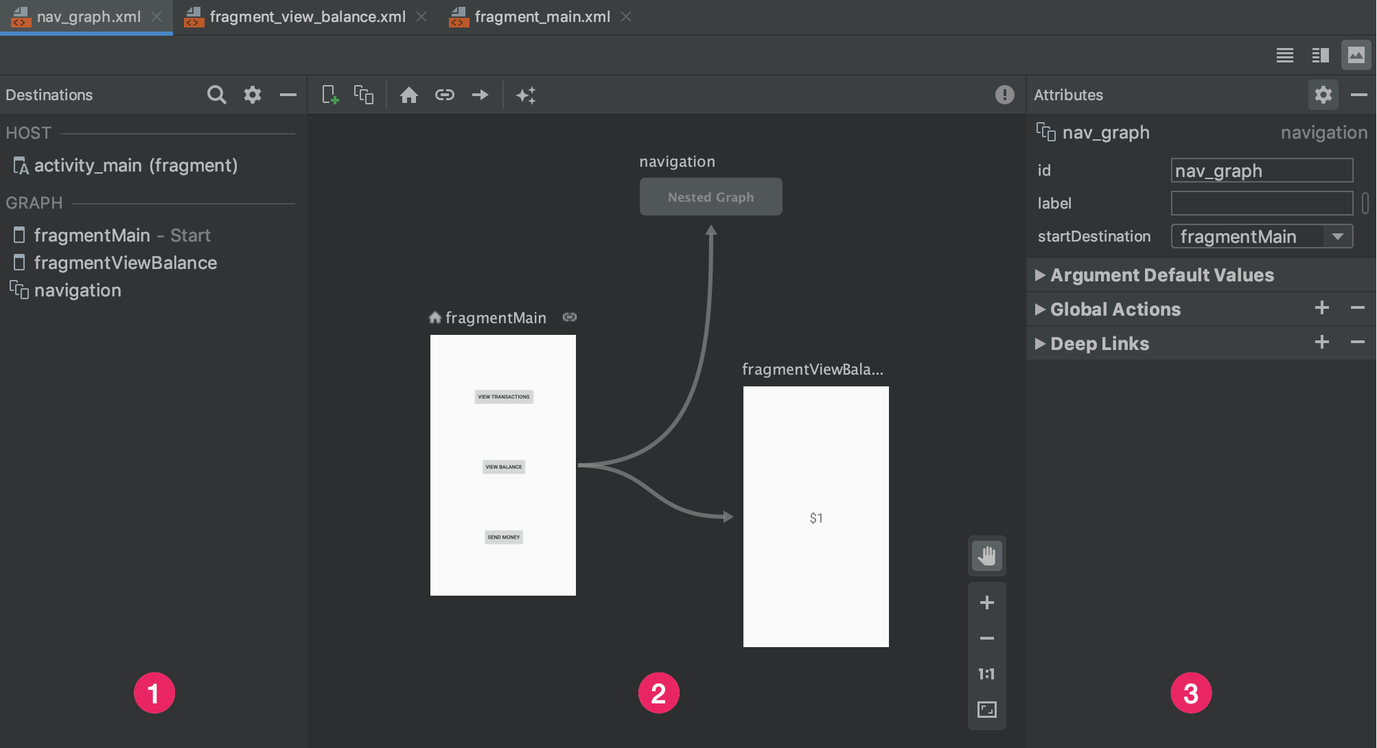 - Graph Editor: Contains a visual representation of your navigation graph. You can switch between Design view and the underlying XML representation in the Text view.