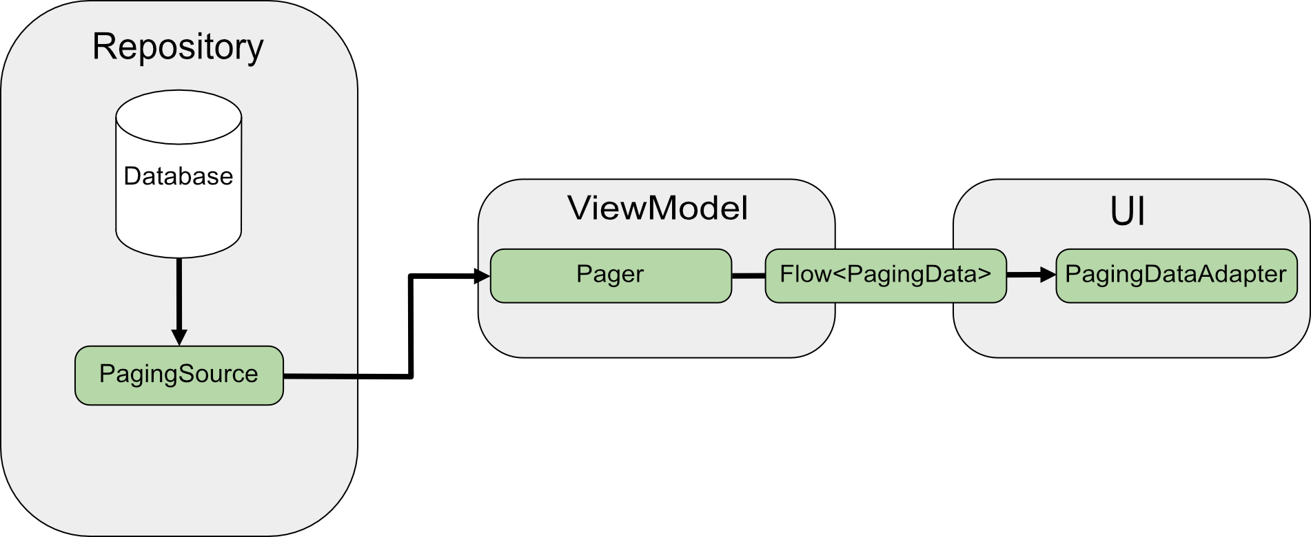 RemoteMediator changes this data flow. A PagingSource still loads the data;