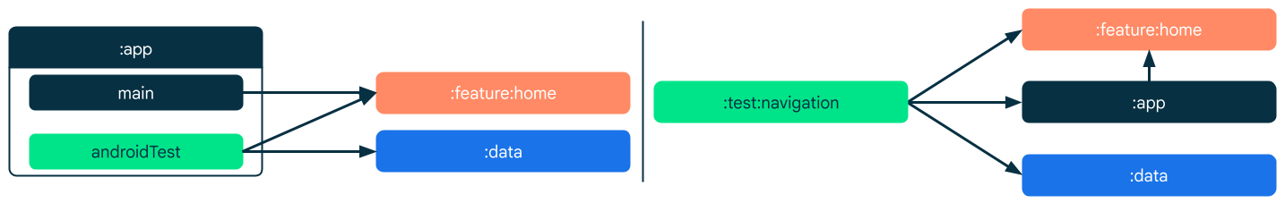 • Shared test code: If you have multiple modules in your project and some of the test code is applicable to more than one module, you can create a test module to share the code. This can help reduce duplication and make your test code easier to maintain. Shared test code can include utility classes or functions, such as custom assertions or matchers, as well as test data, such as simulated JSON responses.