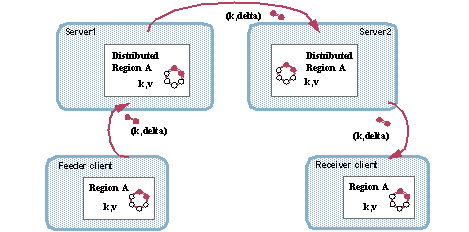 1. In the Feeder client, the application updates the entry object and puts the entry. In response to the put, Geode calls hasDelta, which returns true, so Geode calls toDelta and forwards the extracted delta to the server. If hasDelta returned false, Geode would distribute the full entry value.