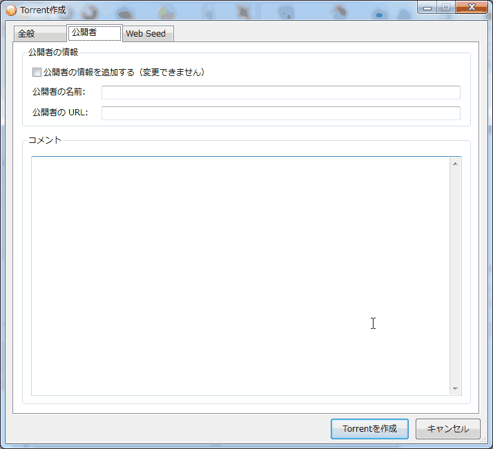 また、「ファイル → Torrentを作成」でも同様のウインドウを表示させることができます。