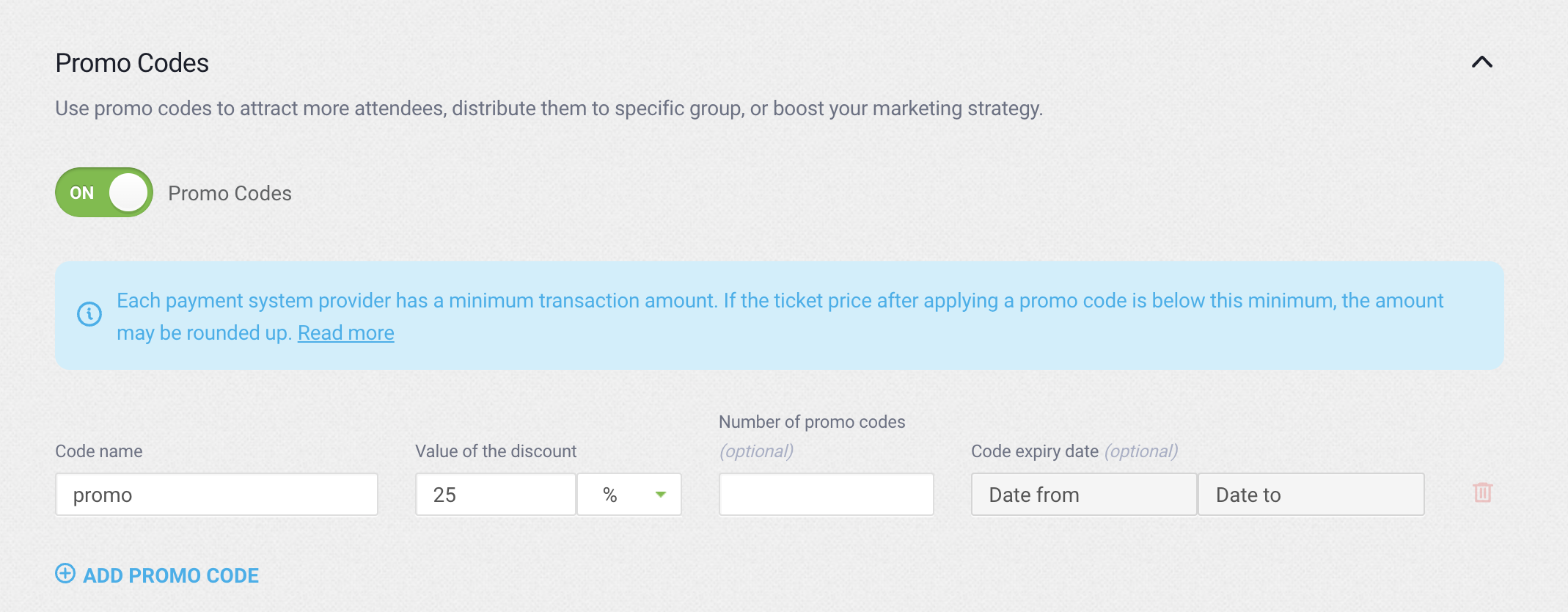 Notez que chaque prestataire de paiement impose un montant minimum pour les transactions. Si une fois le code promo appliqué, le prix du billet est inférieur à ce montant, il pourrait être arrondi à la hausse. Pour en savoir plus, consultez ces informations :