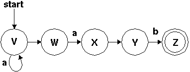Let's look at the machine above. Let's see what it says about "ab". The start circle is V, so we start out by putting a penny there. And then, because there's a blank arrow from V to W, We immediately put a second penny on W. Now the machine is ready to read input. It reads the "a". the penny on V moves along the arrow to V, and the penny on W moves along the arrow to X, so we now have pennies on V and X. Now, because there's a blank arrow leading from X to Y, we place a third penny on Y, and because there's a blank arrow from V to W, we place a fourth penny on W.