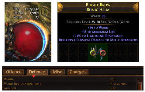 Path of Exile: Expedition introduced a new defence type, Ward. For Expedition base type items, instead of Armour, Evasion and Energy Shield, these items have Ward.