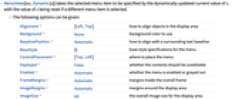 Alignment {Left,Top} how to align objects in the display area Background None background color to use BaselinePosition Automatic how to align with a surrounding text baseline BaseStyle {} base style specifications for the menu ControlPlacement {Top,Left} where to place the menu Deployed False whether the contents should be uneditable Enabled Automatic whether the menu is enabled or grayed out FrameMargins Automatic margins inside the overall frame ImageMargins Automatic margins around the display area ImageSize All the overall image size for the display area LabelStyle {} style specifications for the menu items - With the default option setting ImageSize->All, MenuView always leaves space for the largest of the expri to be displayed, so that its overall size does not change.