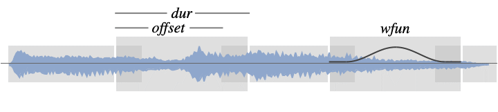 dur partitions of length dur seconds and automatic overlap {dur,offset} uses the specified offset {dur,offset,wfun} applies wfun to each partition - Specifications for dur and offset can be scalars, time quantities or "Samples" quantities.