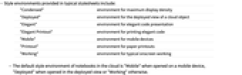 "Condensed" environment for maximum display density "Deployed" environment for the deployed view of a cloud object "Elegant" environment for elegant code presentation "Elegant Printout" environment for printing elegant code "Mobile" environment for mobile devices "Printout" environment for paper printouts "Working" environment for typical onscreen working - The default style environment of notebooks in the cloud is "Mobile" when opened on a mobile device, "Deployed" when opened in the deployed view or "Working" otherwise.