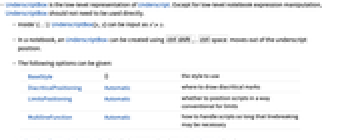BaseStyle {} the style to use DiacriticalPositioning Automatic where to draw diacritical marks LimitsPositioning Automatic whether to position scripts in a way conventional for limits MultilineFunction Automatic how to handle scripts so long that linebreaking may be necessary - In StandardForm, UnderscriptBox[x,y] is interpreted on input as Underscript[x,y].