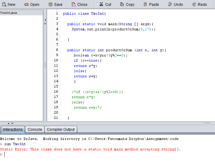Welcome to DrJava. Working directory is C:\Users\Fatoumata\Dropbox\Assignment\code