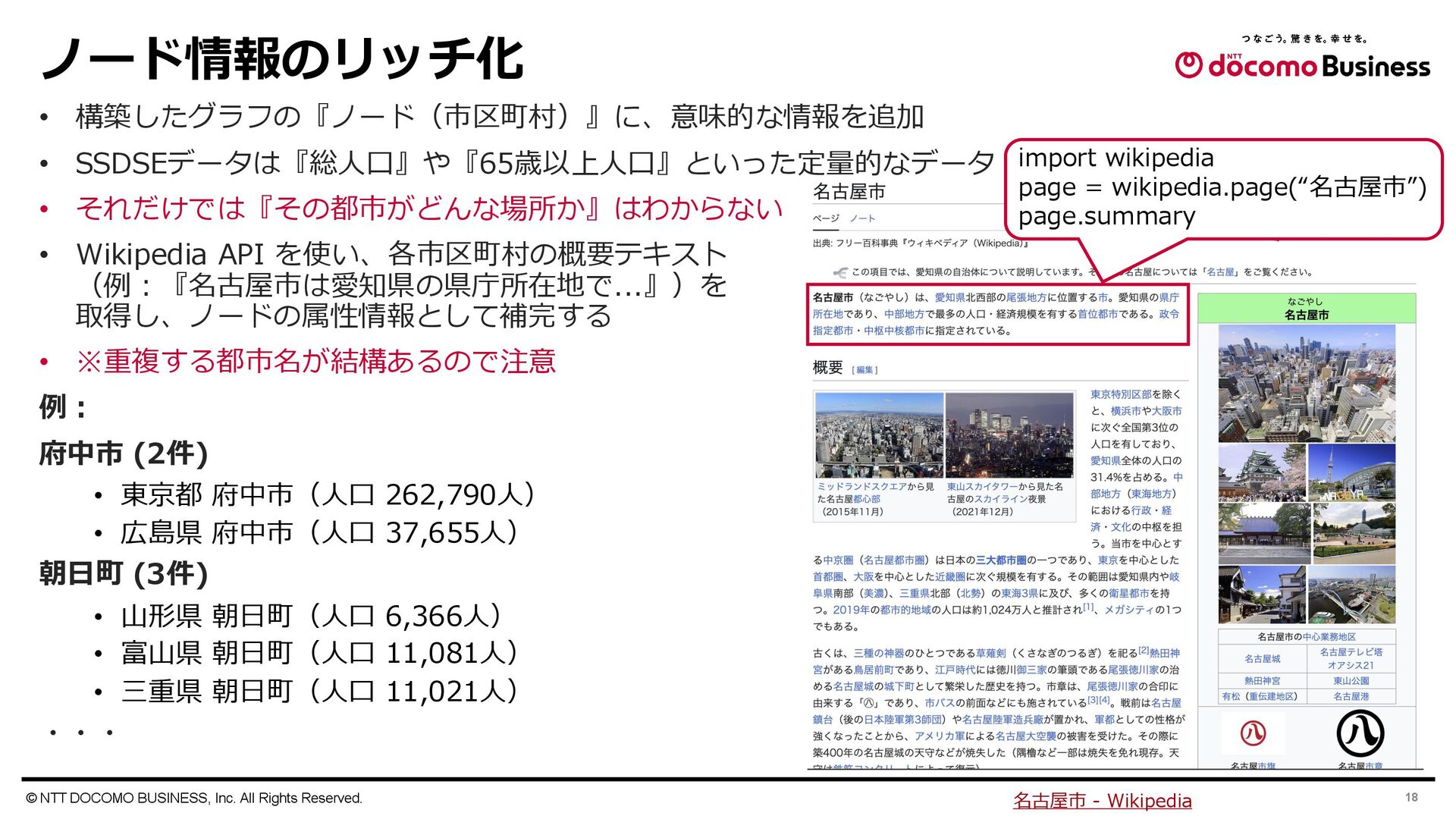 本発表では、pandasとnetworkxを用いて都市間の人の流れを表現する「人口移動ナレッジグラフ(知識グラフ)」を題材として、構築するまでに必要となる技術要素について解説を行います。