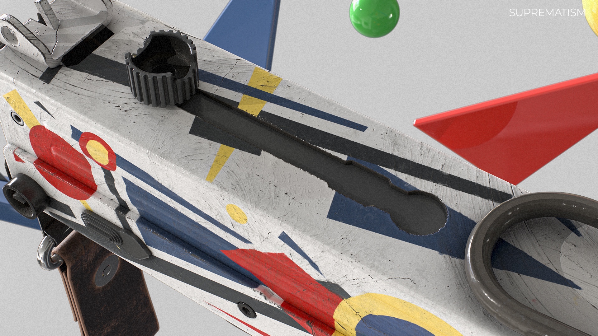 My friend JJ and I decided to implement a skin, the idea of which is to combine suprematism and realism. We wanted each element of the skin not only to stand out, but also to create a harmonious whole that would attract attention. JJ, using his approach to working with suprematism, seeks to express the "purity" of color, rejecting realistic shapes, while I try to add realism in the form of metal and plastic materials. The use of bright color spots in combination with cool shades of metal creates an effect of depth and layering.