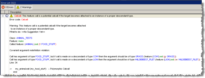 Likewise the compiler in EiffelStudio will produce warnings in cases in which catcalls are possible. Below is an example of the compiler warning issued on the example.