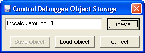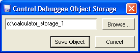By Pick-and-Dropping a debuggee object onto the button [ [[Image:execution-object-storage-icon]] ], you raise the "save" dialog. Then you need to choose the name for the file into which EiffelStudio will store the debuggee object.