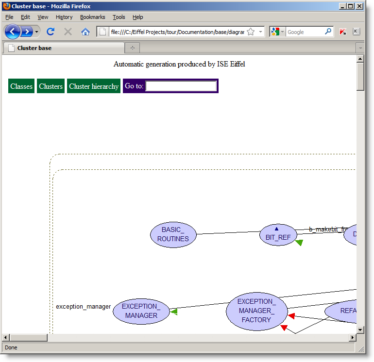 This indicates the relations of the cluster to others in the hierarchy, and its list of classes. Again you could click any class name but instead note the link (diagram) next to the cluster name near the top. Remember that when generating the documentation we elected to generate everything, diagrams included. Hadn't we checked the corresponding check box, the (diagram) link wouldn't be there. Click it now to get the diagram that has been generated for BASE: