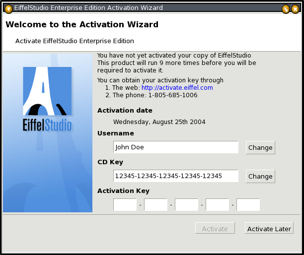 The first time you launch EiffelStudio, you will be asked for an activation key through the following dialog: