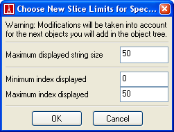 Located in the object tool toolbar, this command changes the display size of special objects (i.e. objects whose class is SPECIAL, most importantly in the representation of arrays and strings). Because special objects may contain thousands of attributes, only the first fifty are displayed by default. If left-clicked, a dialog is popped up that sets the exploration indices of special objects that will be loaded in the future.