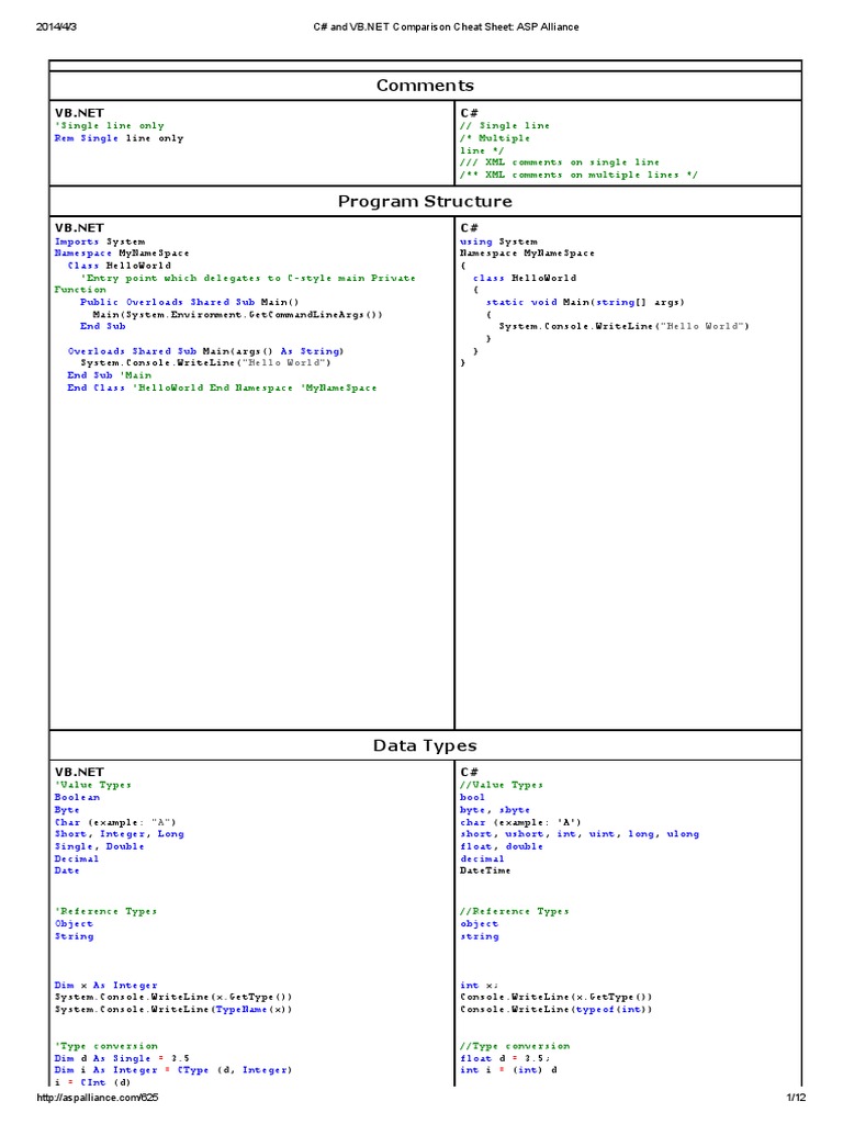 C# and VB.NET Comparison Cheat Sheet: ASP Alliance