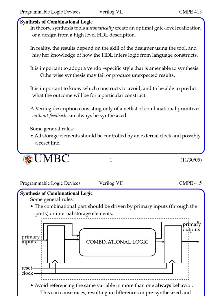 Synthesis of Combinational Logic In theory, synthesis tools automatically create an optimal gate-level realization of a design from a high level HDL description. In reality, the results depend on the skill of the designer using the tool, and his/her knowledge of how the HDL infers logic from language constructs. It is important to adopt a vendor-specic style that is amenable to synthesis. Otherwise synthesis may fail or produce unexpected results. It is important to know which constructs to avoid, and to be able to predict what the outcome will be for a particular construct. A Verilog description consisting only of a netlist of combinational primitives without feedback can always be synthesized. Some general rules: All storage elements should be controlled by an external clock and possibly a reset line.