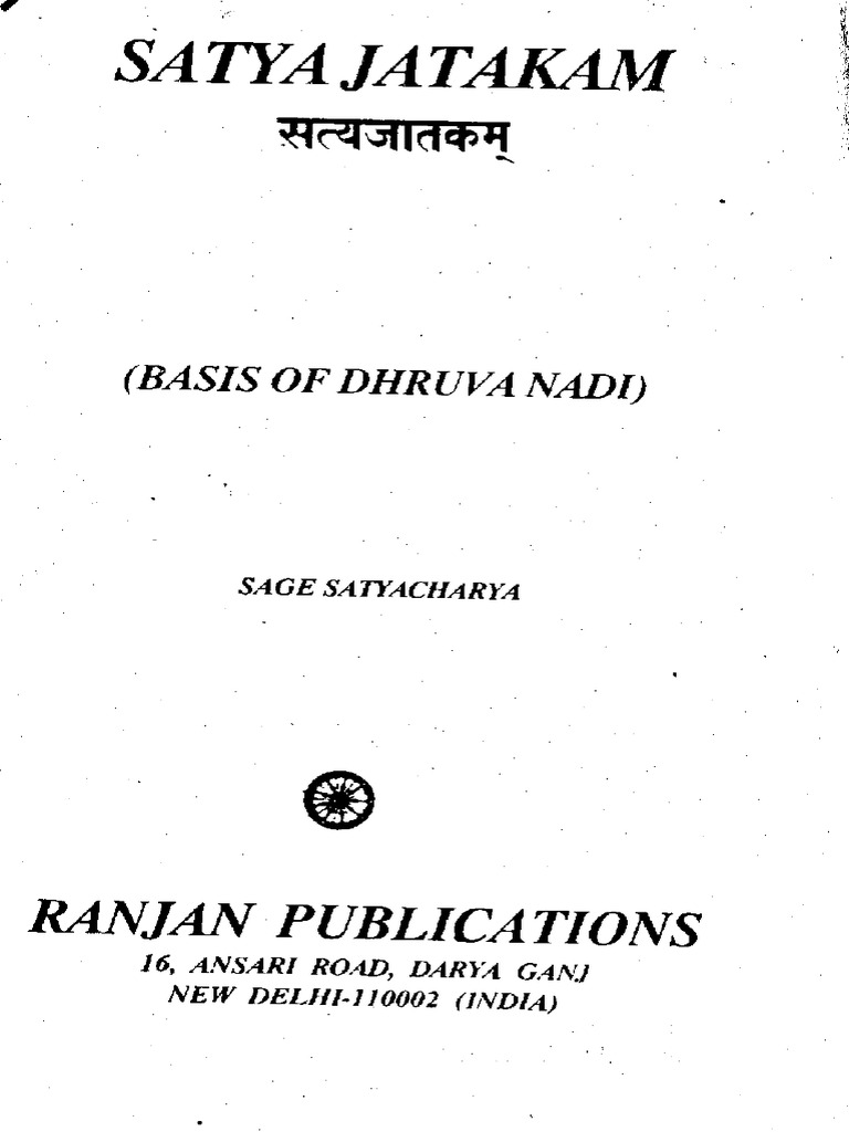 This is an English version of a great Astrqlogical work by _ Satyacharyaconsidered to embody the principles of Dhruva Nadi and Satyasamhita Nadi. It is told in this work that the principleswere communicatedby Dhruva to Jaimini, who in turn passedit on to Garga who transmitted them to Vyasa, wherefrom Satya Rishi got therr. The name of Satyacharyaoccures in Brihatjaraka. e,xpres.sly quoted by Varahamihira with great reverenceseveraltimes. Vide :