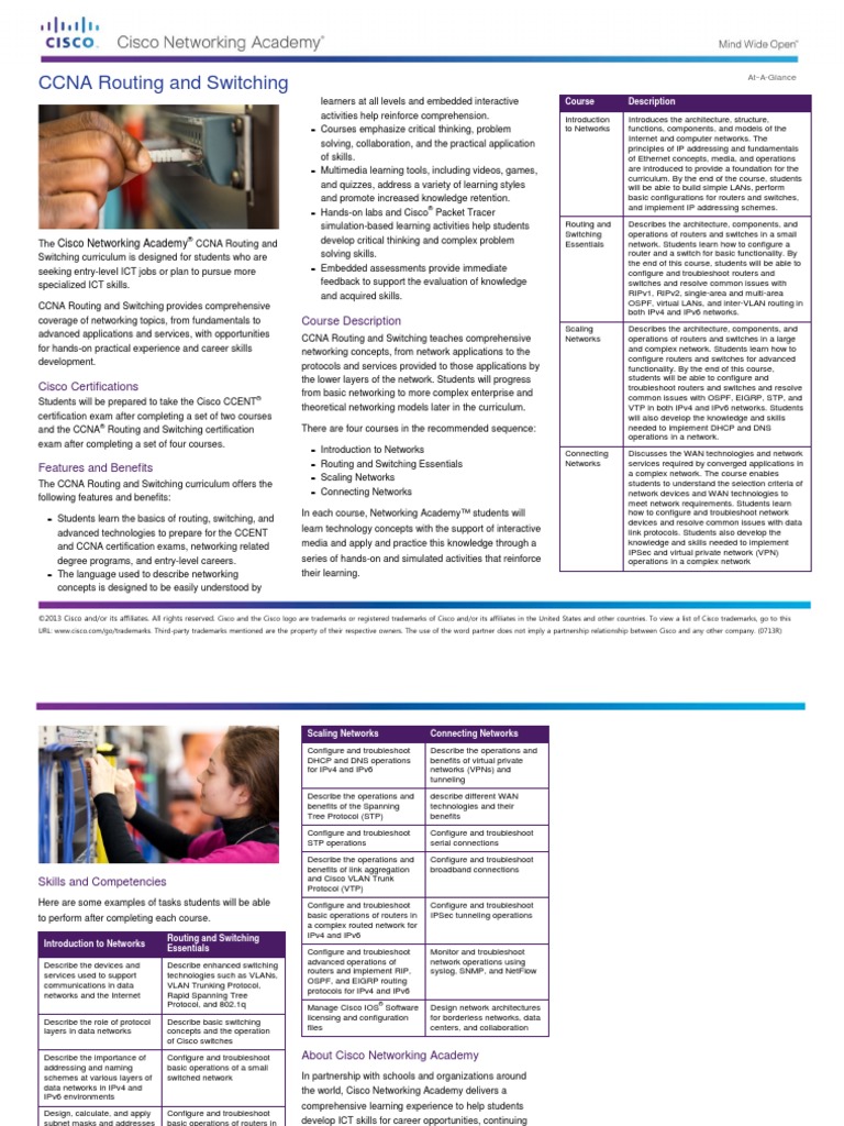 Cisco and the Cisco logo are trademarks or registered trademarks of Cisco and / or its affiliates in the United States and other countries. CCNA Routing and Switching curriculum is designed for students who are seeking entry-level ICT jobs or plan to pursue more specialized ICT skills. Students will be prepared to take the Cisco CCENT (r) certification exam after completing a set of two courses.