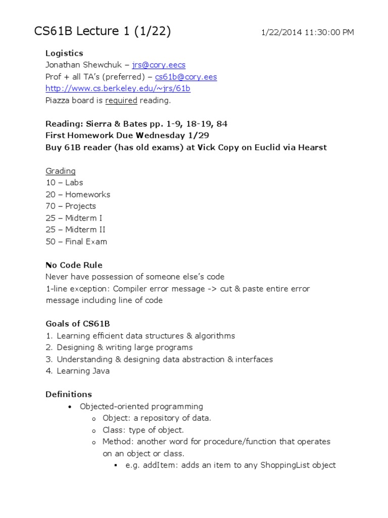 CS61B Lecture 1 (1/22) 1/22/2014 11:30:00 PM