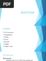 The document discusses various CSS selectors, properties, and comments that can be used to style HTML elements. It also provides examples of how to use CSS internally, inline, and externally. Additionally, it covers the Bootstrap framework, including its grid system, responsive images and tables, basic typography styles, and advantages of using Bootstrap.