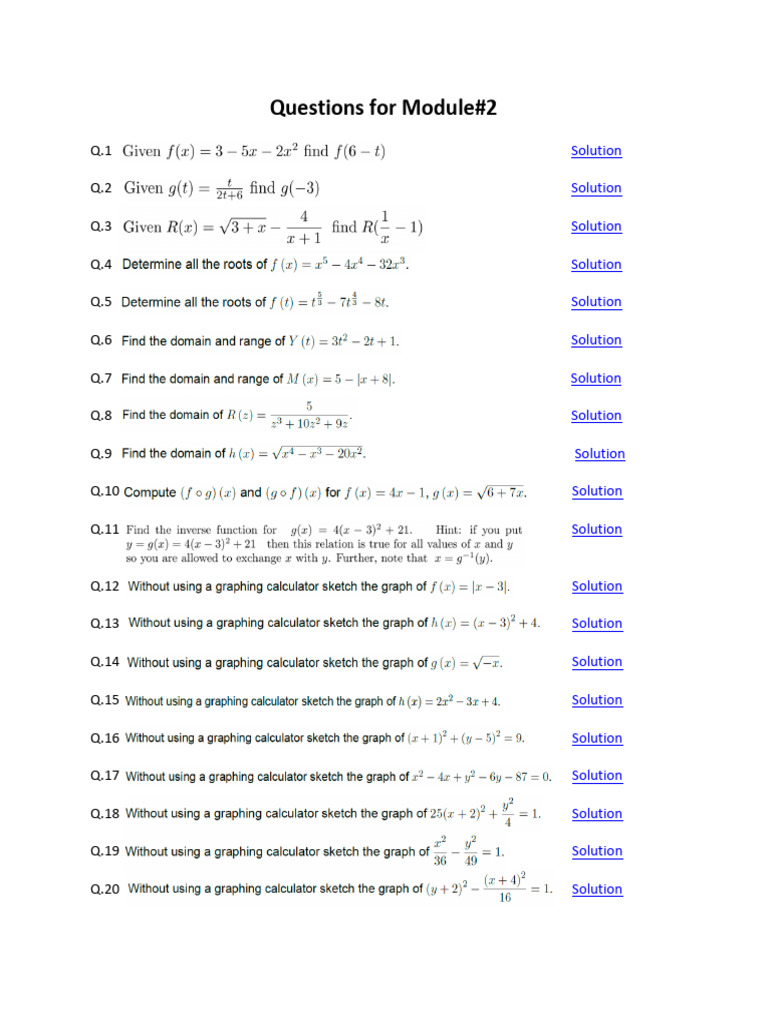 The document contains a list of questions from Module #2, each followed by a corresponding solution. There are a total of 20 questions addressed in this format. The document is structured to provide clear answers to each question.