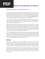 Why do we teach our students about bases other than the usual base-10? Base 2, 8 and 16 are used in computers, as we will explain. Also, working in other bases helps them understand the place-value and methods of arithmetic in base 10. Moreover, other bases give an introduction to the very important area of modular arithmetic, which is one of the most basic techniques used in applications of mathematics to things like encoding data, digital signal processing and other important processes. Computers represent all data (numbers, text, symbols, etc.) as binary symbols. These are written on paper as the digits 1 and 0, though they are stored in the computer as patterns of voltages (usually +5 volts for 1 and 0 volts for 0). Using just the digits 1 and 0, numbers of any size can be built up.