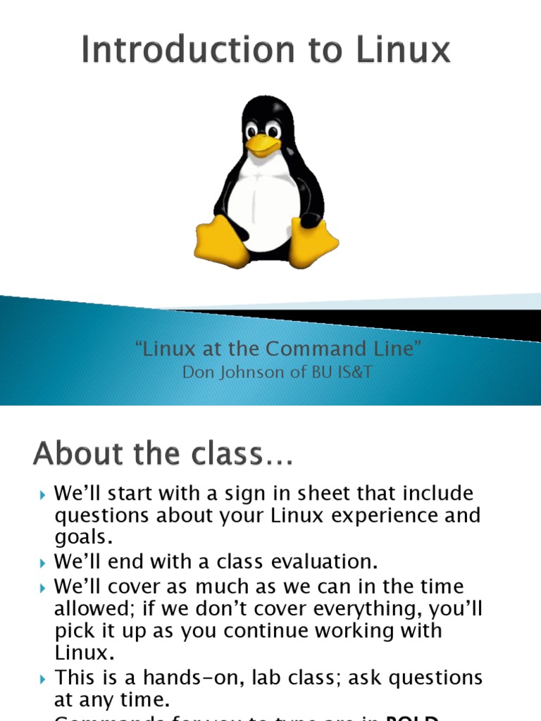 The document describes an upcoming "Linux at the Command Line" class which will cover basic Linux commands and navigation. It will start with a sign-in sheet, cover material through hands-on labs, and end with a class evaluation. The document provides an overview of common Linux commands that will be covered related to shells, system information, file systems, and file editing.