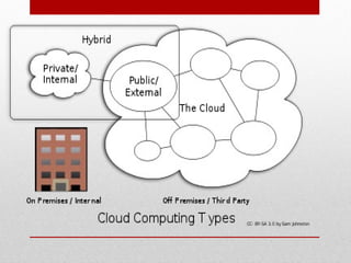 Cloud computing refers to accessing software and data storage over the internet rather than locally. There are three main types of cloud services - Software as a Service (SaaS), Platform as a Service (PaaS), and Infrastructure as a Service (IaaS). SaaS provides end users access to online applications, PaaS provides developers platforms to build apps, and IaaS provides network architects computational resources like storage, servers, and networking. Cloud computing offers advantages like reduced costs, scalability, and accessibility but also risks like dependence on providers and potential performance issues.