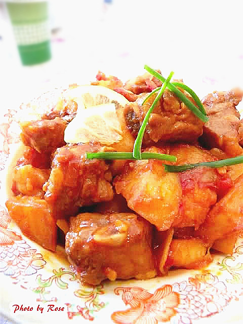 五、煮到排骨较软了,放盐、生抽,试试味,用糖、白醋或柠檬汁来调整,倒入土豆,和排骨一起烧至土豆熟透;