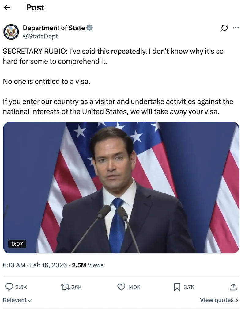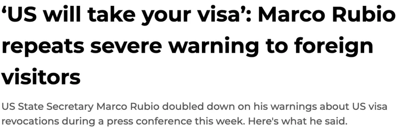 本周,美国国务卿马尔科·鲁比奥(Marco Rubio)在布达佩斯与匈牙利总理欧尔班(Viktor Orban)联合记者会上再度表态,“签证不是权利,而是一种特权,我们可以随时收回。”并表示,持有签证并不等于安全无忧,任何可能被认定为“损害国家安全或利益”的行为,都可能成为被撤签的理由。
